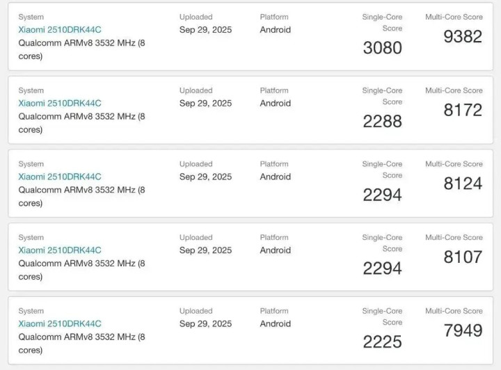 与此同时,REDMI K90 手机已经现身 GeekBench 跑分,其型号为“2510DRK44C”,单核最高跑分为 3080 分,多核最高跑分为 9382 分。