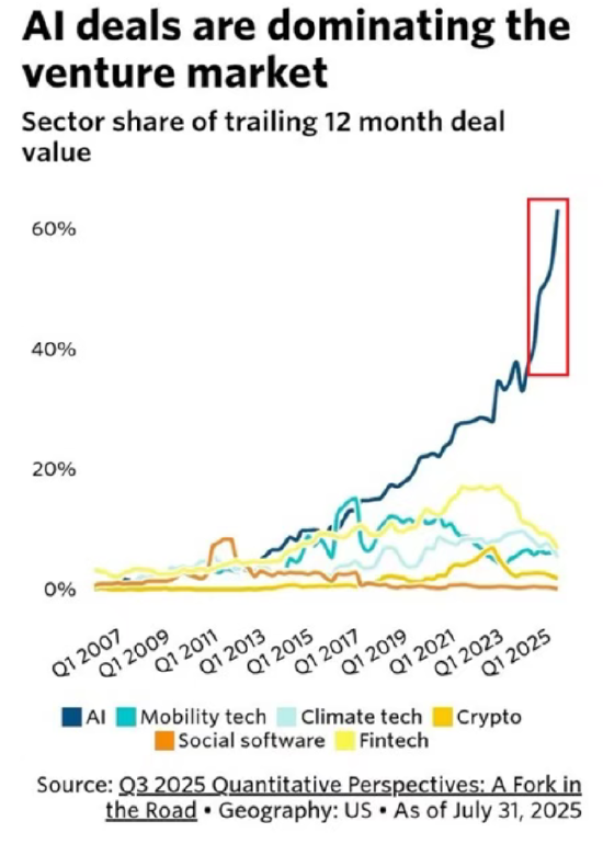 更令人侧目的是,2025年迄今为止,风投资本已向人工智能领域注入1927亿美元,几乎是创纪录级别的“all-in”下注。这让人断言:2025年极有可能成为AI首次揽获VC资金过半份额的一年。
